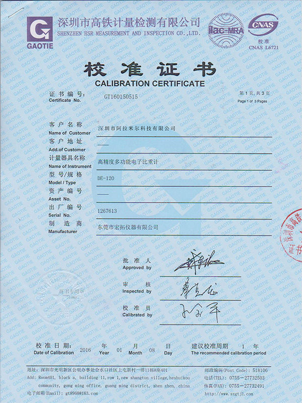 密度計(jì)校準(zhǔn)證書