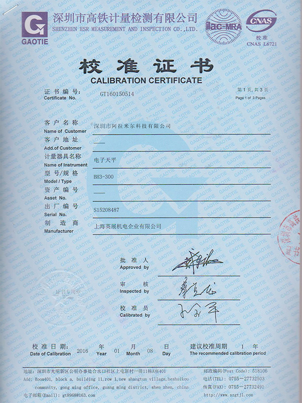 電子天平校準(zhǔn)證書